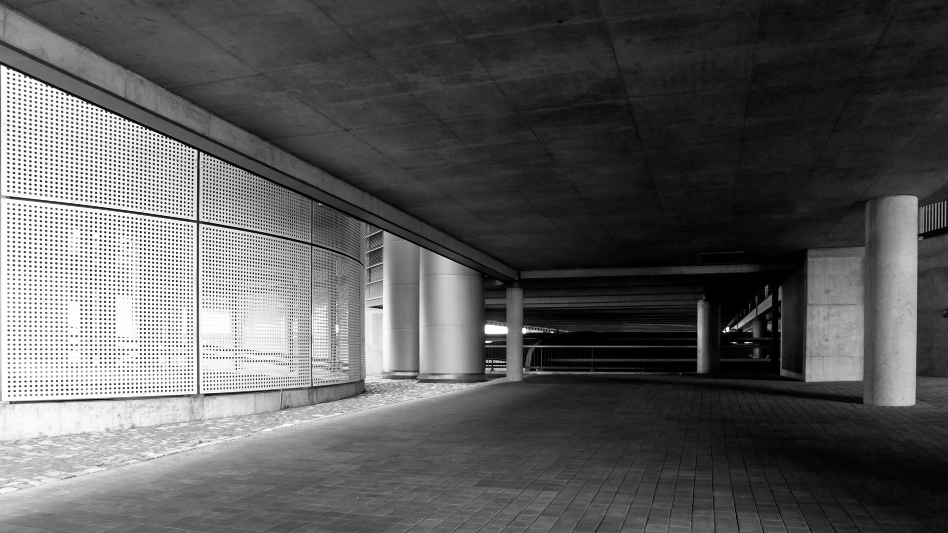 Die Auffahrrampen mit den gelochten Metallpaneelen werden zu abstrakten Gebilden. Durch die Lochung kann man die dahinterliegenden Strukturen  erahnen.