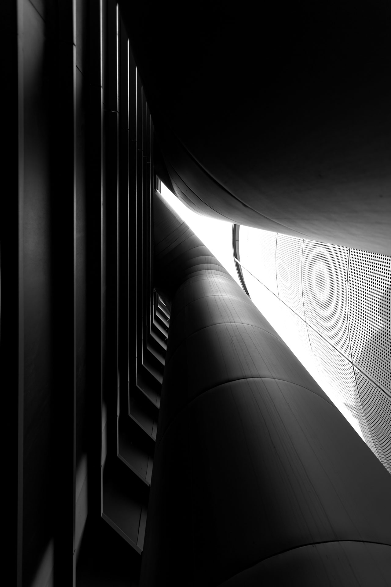 Die Auffahrrampen mit den gelochten Metallpaneelen werden zu abstrakten Gebilden. Durch die Lochung kann man die dahinterliegenden Strukturen  erahnen.