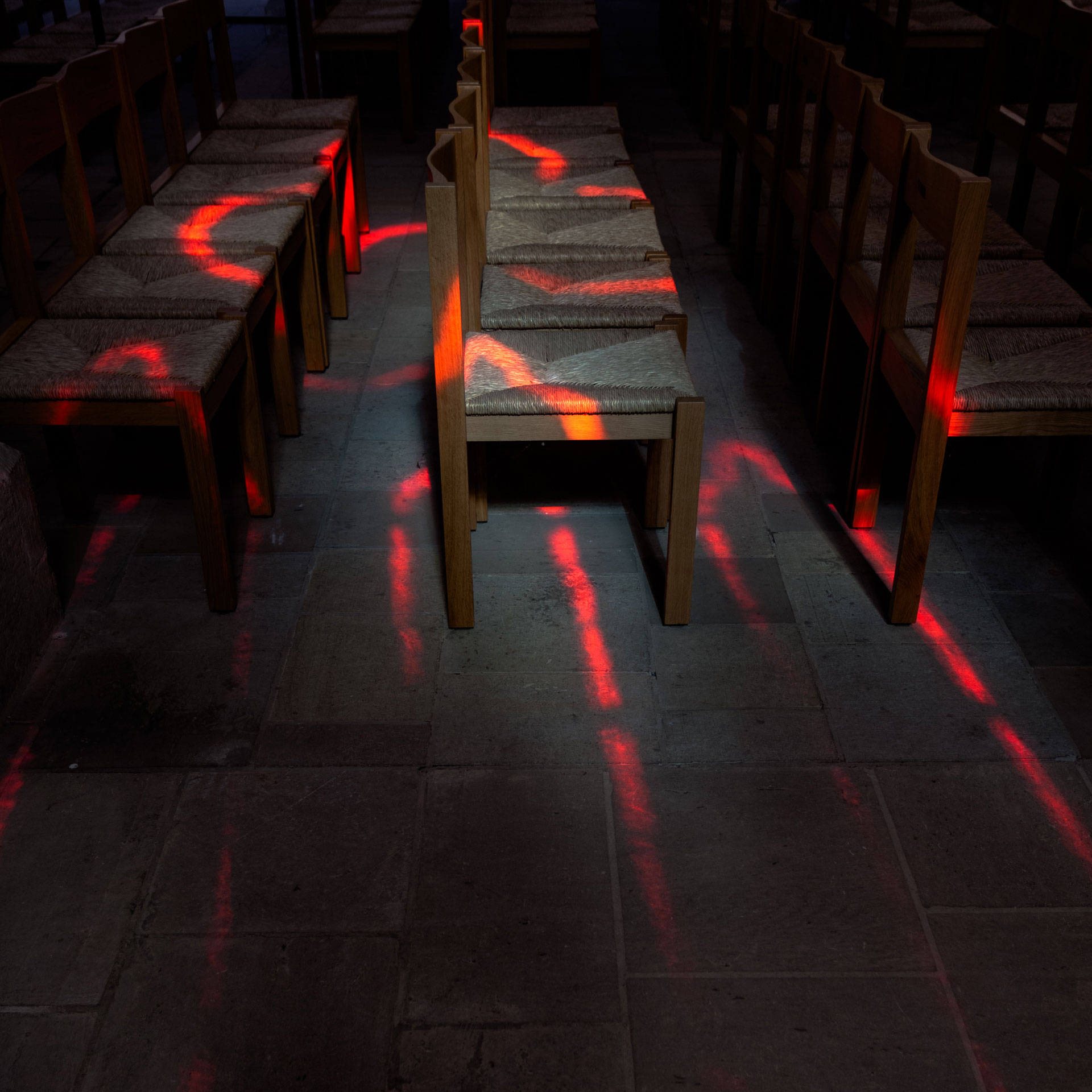 Die Kirche des Zisterzienserklosters in Schulpforta ist ein schlichter Bau. Im Gegensatz zu anderen Kirchenbauten sind auch die Bleigalsfenster schlicht gehalten. Einzig eine rote Umrandung umgibt die ansonsten durchsichtigen Fensterscheiben. In der richtigen Lichtsituation „malen“ diese roten Linien ihre Abbildung auf die einfachen Mauern, Säulen und das Inventar.