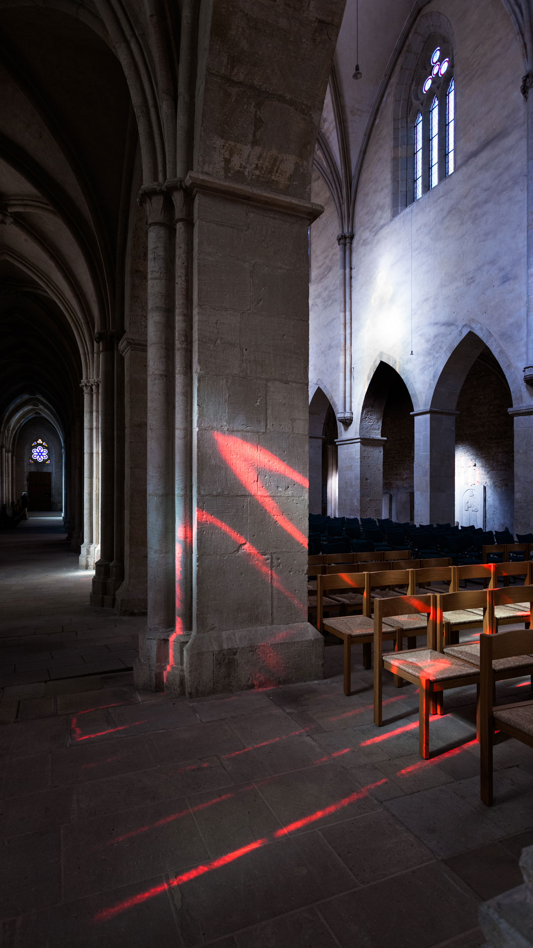 Die Kirche des Zisterzienserklosters in Schulpforta ist ein schlichter Bau. Im Gegensatz zu anderen Kirchenbauten sind auch die Bleigalsfenster schlicht gehalten. Einzig eine rote Umrandung umgibt die ansonsten durchsichtigen Fensterscheiben. In der richtigen Lichtsituation „malen“ diese roten Linien ihre Abbildung auf die einfachen Mauern, Säulen und das Inventar.